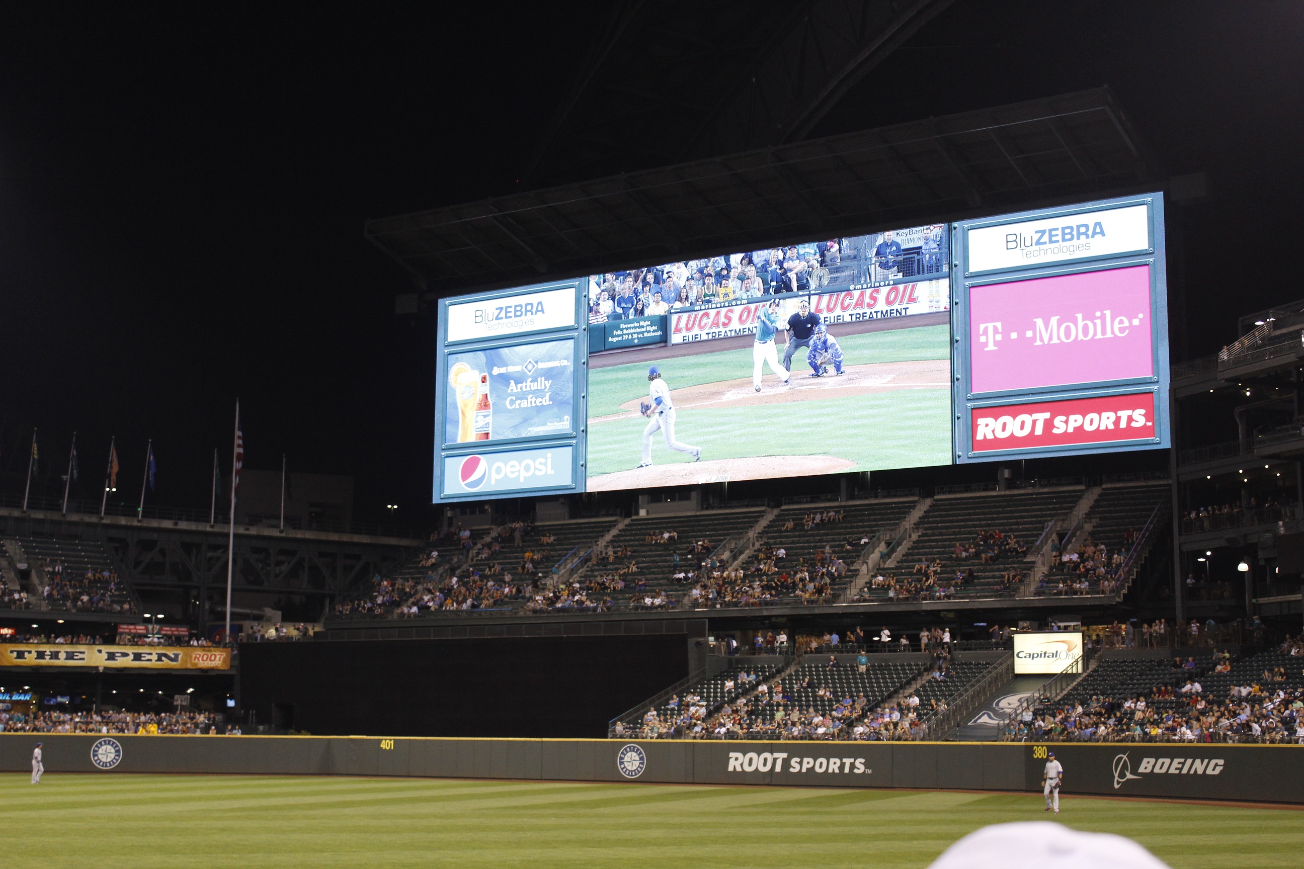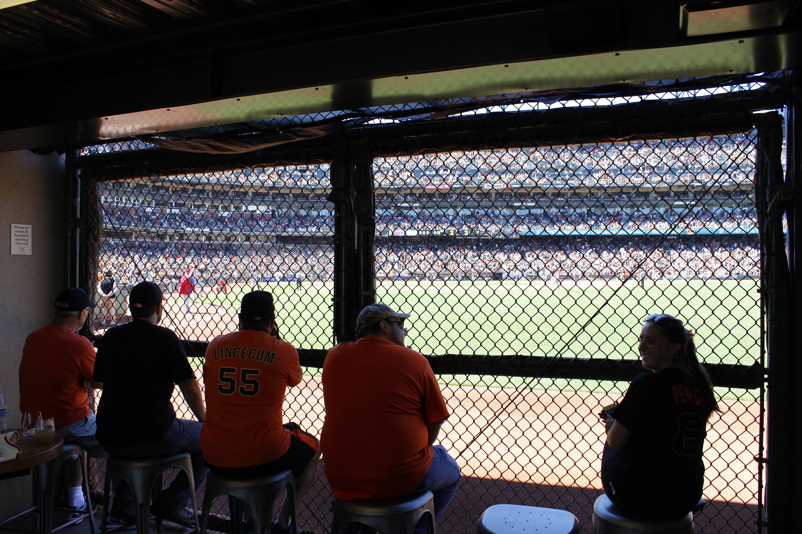 Assis à nos bancs, on observe un peu autour de nous. Une particularité du stade est que, sous l’abri qui recouvre le balcon supérieur, les architectes ont décidé d’installer du soffite au lieu de laisser la vue sur les traverses d’acier ou le béton. Aussi, on observe le Budweiser Deck au champ gauche, un grand bar d’où les fans peuvent observer le match. D’ailleurs, au balcon supérieur, les fans ont accès à un bar derrière le marbre d’où nous avons une belle vue un peu comme celle que l’on voit en général aux niveaux plus bas, mais celui-ci ne requiert aucun billet particulier et est ouvert à tous! On apprécie en tant que fans qui ne peuvent pas payer 65$ pour des billets!